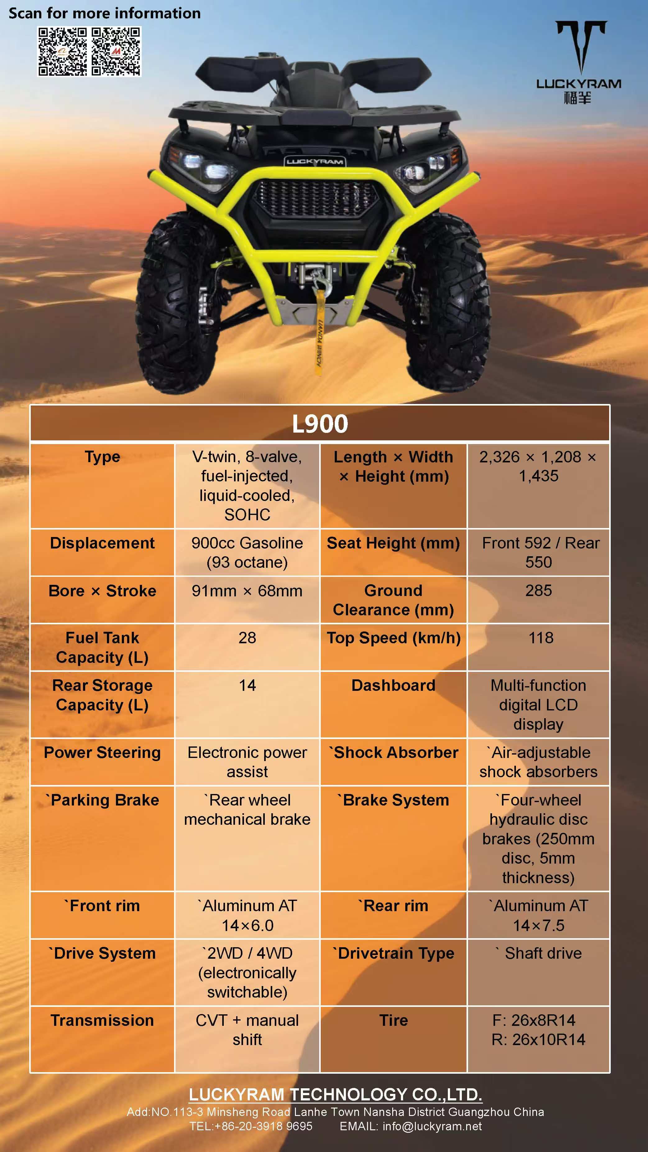 طاقتور انجن-ایک اعلی کارکردگی 900 سی سی 4 اسٹروک انجن سے آراستہ ، آف روڈ مہم جوئی کے لئے مضبوط ٹارک اور ایکسلریشن فراہم کرتا ہے۔ روبسٹ معطلی-آزاد یا طویل سفر کے معطلی کے نظام کی خصوصیات ہے ، جس میں کھردری خطوں پر ہموار سواریوں کو یقینی بنانا ہے۔ کیچڑ ، ریت ، اور پتھریلی ٹریلس۔ اعلی صلاحیت کا بوجھ اور ٹاؤنگ-مضبوط ریکوں اور ایک باندھنے والی رکاوٹ کے ساتھ ڈیزائن کیا گیا ہے ، جو کام یا تفریح کے لئے بھاری بوجھ ڈالنے کی صلاحیت رکھتا ہے۔ ہائیڈرولک ڈسک بریک (فرنٹ اینڈ ریئر) تیز ، محفوظ اسٹاپس کو تیز رفتار سے یقینی بناتے ہیں۔ گیئر۔ سرچ اینڈ ریسکیو - ایمرجنسی مشنوں کے لئے ریموٹ یا مشکل خطے میں قابل اعتماد کارکردگی۔